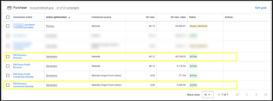 You can now see a significant change in reported revenue, being reported from the two new conversions ("PM Revenue - Browser" + "PM Revenue - Conversion Booster")
